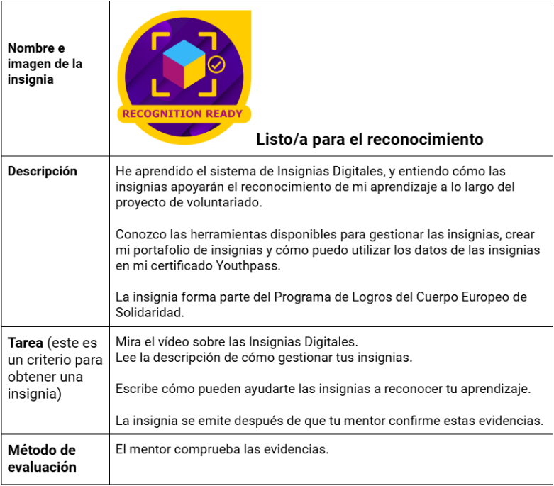 • Dado que las insignias se mostrarán en la web, es conveniente que la descripción de la insignia contenga la información suficiente para comprender el logro y su contexto.