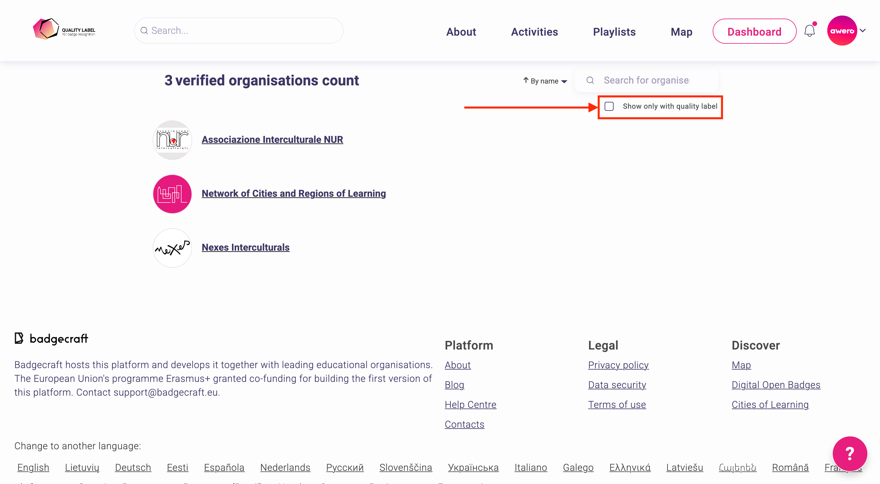 Users can filter for activities/playlists organised by Organisers awarded the Quality Label.