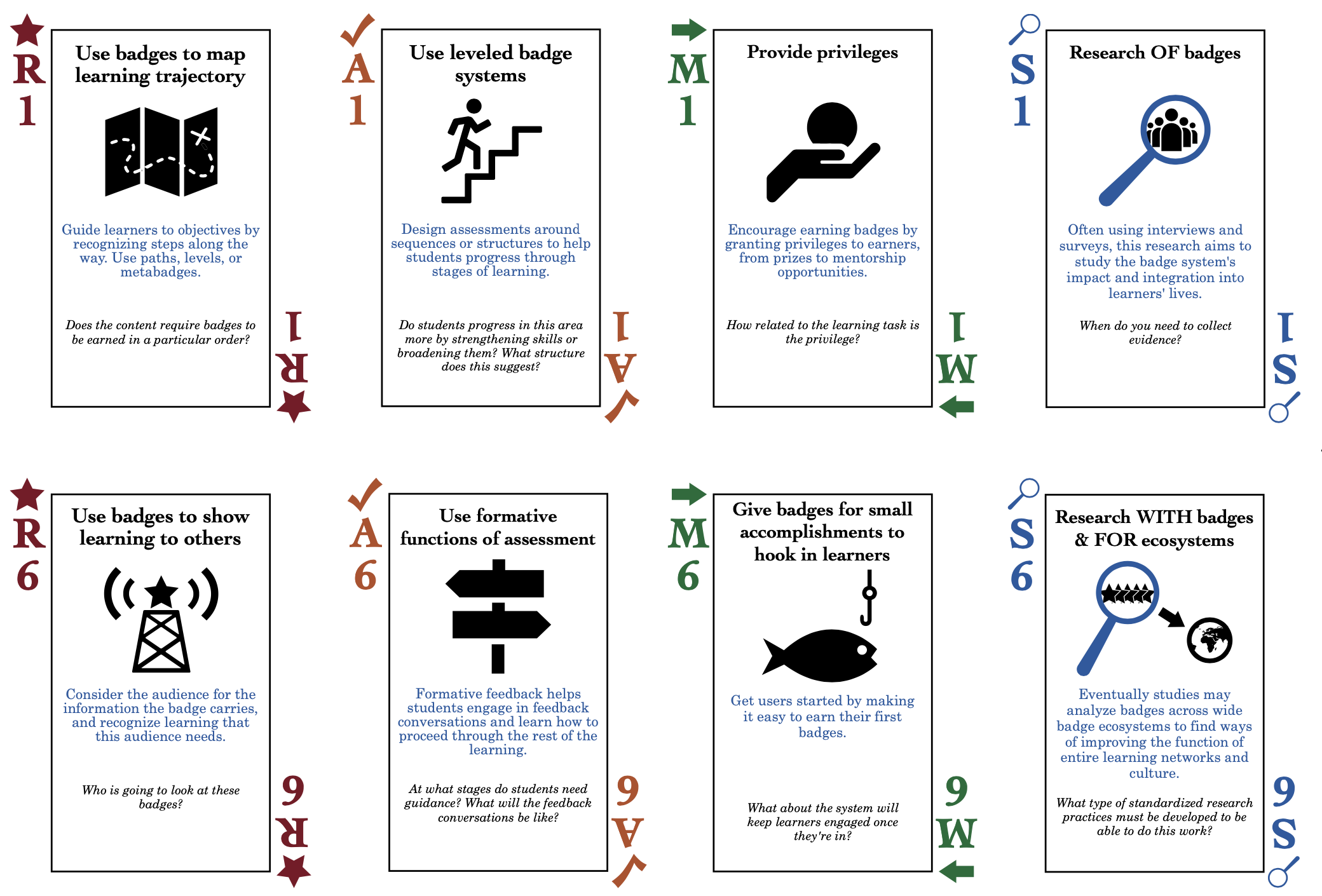 DPD projektas išnagrinėjo 30 atvirųjų ženkliukų iniciatyvų iš 2012 m. DML ženkliukų konkurso, remiamo „MacArthur Foundation“, ir sukūrė šį kortelių rinkinį, suteikiantį idėjų daugiau nei 30 ženkliukų tikslų keturiose srityse: