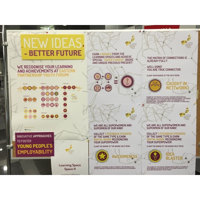 During the Forum participants were engaged in various quests, workshops, conversations, development meetings and informal conversations. New experiences and learning were inevitable and all of it was shown visually by collecting Open Badges. Posters informing what kind of learning can happen and which Open Badge can be acquired in a specific place at the certain time were placed all around the working space.